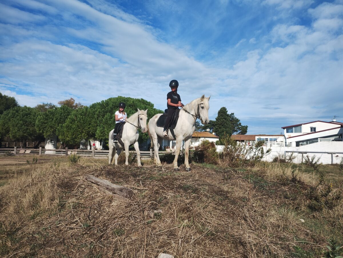 Nous avons réservé quatre nuits dans un hôtel en pleine nature aux Saintes Maries de la Mer. L’hôtel propose des activités équestres. Nous y accompagnons les aînées de nos petits-enfants, âgées de 10 ans et 8 ans, pour des cours d’équitation matin et après-midi. Michel, le professeur, presque septuagénaire, est un remarquable pédagogue. Avec humour, il enseigne comment monter le cheval, mais surtout comment se relationner avec lui.
