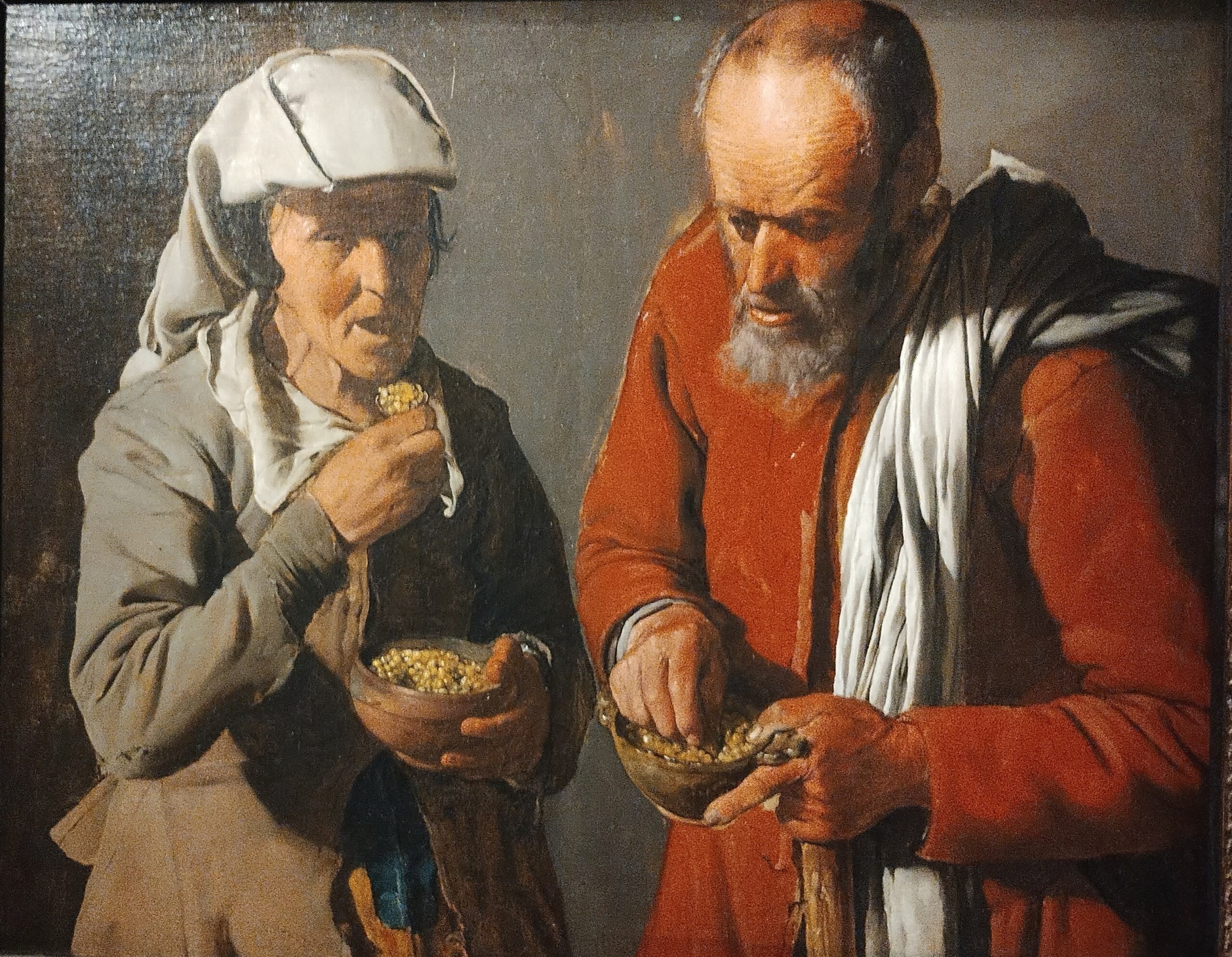 Plusieurs tableaux diurnes sont aussi présentés dans l’exposition. J’ai aimé la salle intitulée « le peintre des infortunés », en particulier un tableau intitulé « les mangeurs de pois ». On lit dans le flyer de l’exposition : « loin du pathos ou de la caricature que d’autres artistes réservent aux pauvres, La Tour leur confère une dignité silencieuse, captant sans jugement la vérité de leur existence. »