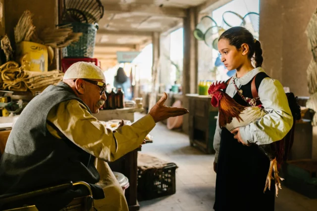 Bibi se rend en ville avec Lamia. Lorsque cette dernière se rend compte que le but du voyage n’est pas le gâteau du président, mais de l’abandonner et de la confier à des inconnus, elle s’enfuit à toutes jambes, portant dans une besace son coq apprivoisé Hindi, qui ne la quitte jamais. Elle rejoint à la foire un camarade d’école, Saeed (Sajad Mohamed Qasem). Elle le convainc de chercher avec elle la farine, le sucre, les œufs et le levain nécessaires pour préparer le gâteau.