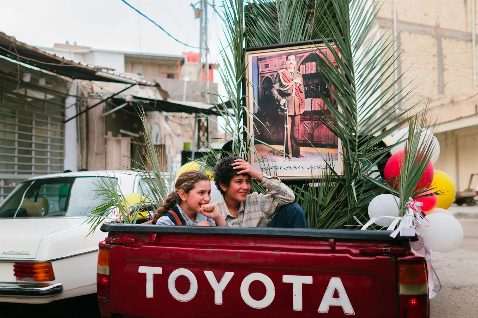 La ville est toute à l’excitation de l’anniversaire du grand chef Saddam, à qui on jure de donner son sang s’il le faut. Dans le ciel, des chasseurs américains anticipent bruyamment un sombre avenir.