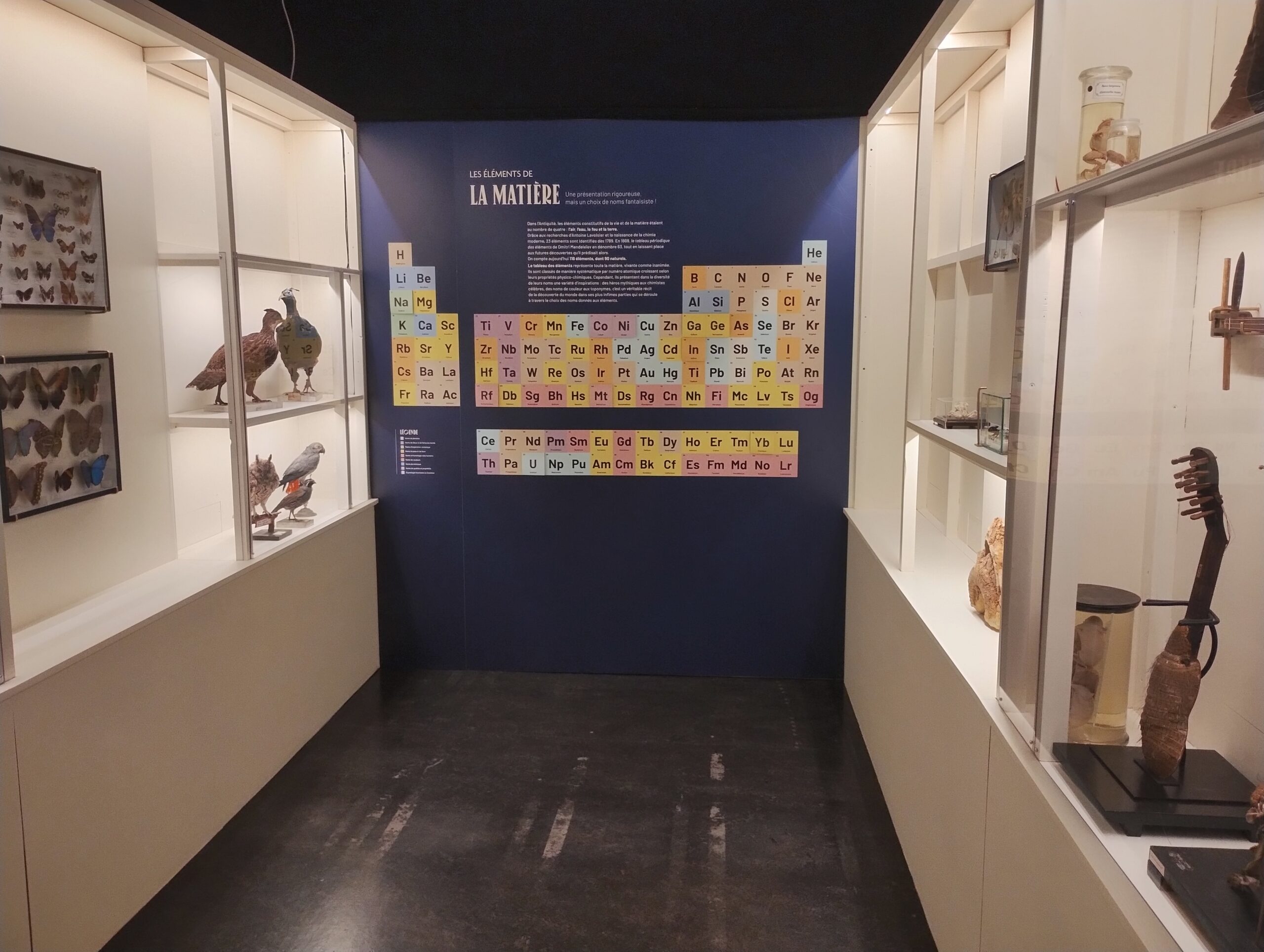 L’exposition « nommer le vivant, dire le monde » s’ouvre par un cabinet de curiosité. On y présente des vivants dont la description ne suffisait pas, il fallait les nommer. Au fond de la salle est présentée la classification périodique des éléments initiée par Mendeleiev. Un panneau est consacré à Antoine Laurent Lavoisier (1743-1794). C’est lui qui, dans deux ouvrages fondateurs de la chimie moderne, donna leur nom au carbone, à l’oxygène, à l’hydrogène et à l’azote.