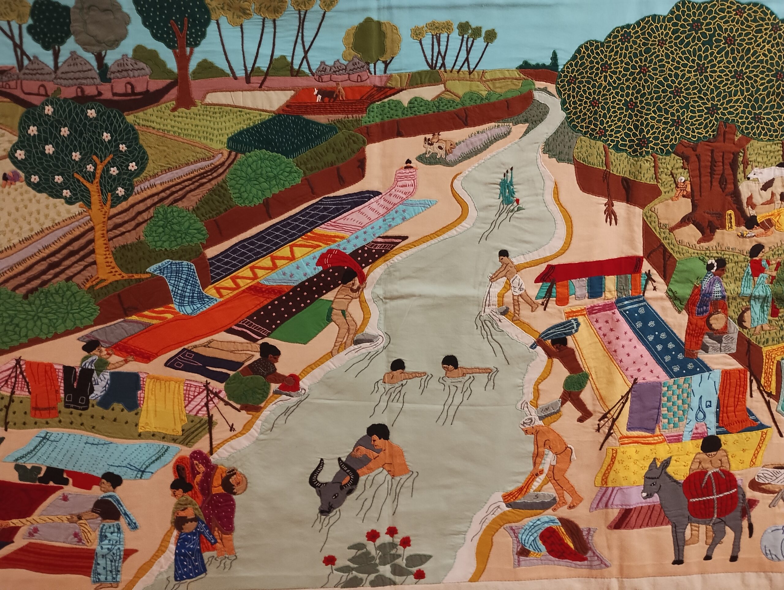 Une salle a été dédiée à une tout autre exposition, intitulée « broder l’Inde, instantanés de vie à Pondichéry ». Sont présentées neuf tentures brodées données au musée par l’association Brodindra. Après la visite plutôt austère des salles scientifiques, on est saisi par les couleurs et la vivacité des scènes représentées.