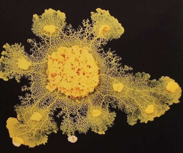 Un être étrange, le Physarum polycephalum ((« petite vessie à plusieurs têtes », 1822), a été surnommé « blob », en référence à un film de science-fiction mettant en scène un extraterrestre géant et gélatineux. On apprend qu’il vit « dans les milieux humides des forêts. Il mange et se déplace comme un animal et génère des pigments (jaunes) comme une plante (…) Espèce unicellulaire cousine des amibes, sa cellule contient des milliers de noyaux et double de taille tous les jours, ce qui en fait un organisme fascinant et monstrueux. »