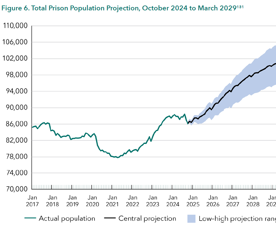 En août 2025 a été publié à Londres un rapport indépendant sur la capacité des prisons en Angleterre et au Pays de Galles (Independent review of prison capacity). Il s’interroge sur les raisons pour lesquelles « l’offre » de places de prison (le nombre de places disponibles) et la « demande » (le nombre de places nécessaires pour loger les prisonniers décemment) ne se sont jamais ajustées.